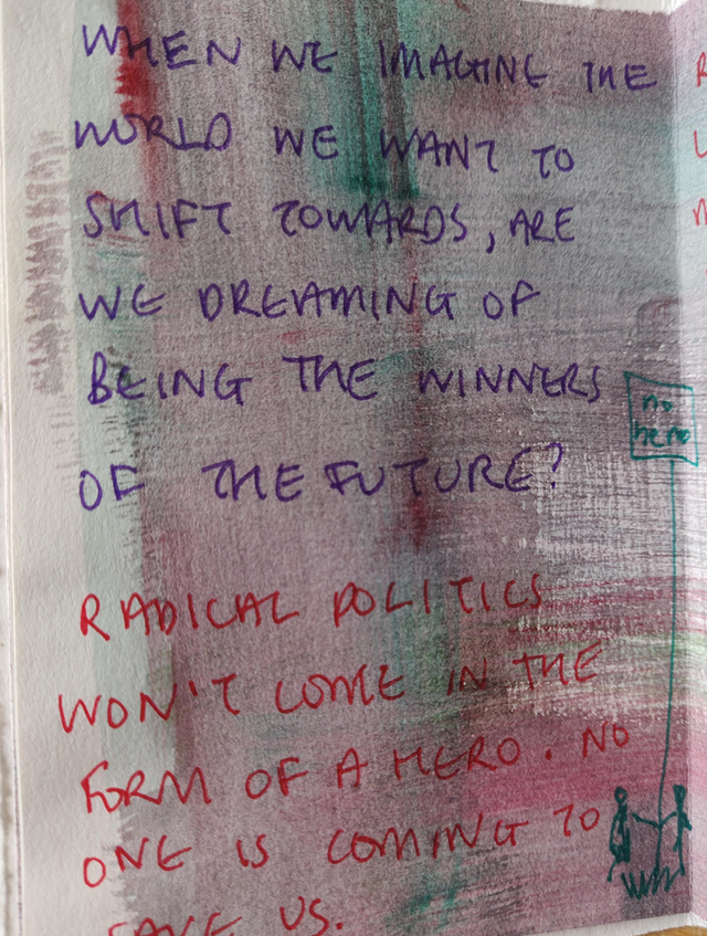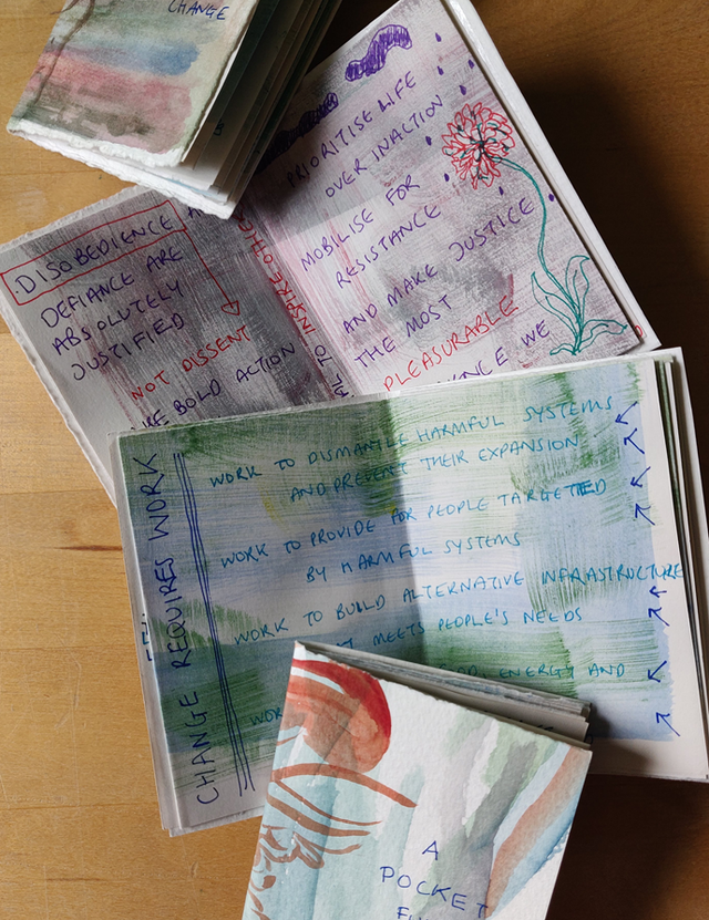 Small unique books handwritten using texts from inspiring works by Grace Byron, Dean Spade, adrienne maree brown and John-Paul Flintoff. For those days when you need to reach into your pocket and pull something out that reminds you why you keep trying to change the way things are. We have them listed at two prices: affordable because we'd love everyone to have one (although this is ambitious given there are currently only four in existence - each is individually numbered!), and labour included because each one took over an hour to make, so this price literally isn't even a minimum wage. all materials and labour are donated so every penny goes into the Solidarity Fund - additional donations much appreciated!